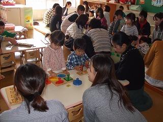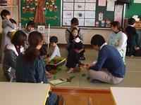 「わらべ歌」の中村秀子先生をお呼びして、親子で触れ合いながら楽しみました。また、クラスで普段の生活の様子を見て頂いたり、制作活動をおうちの人と行なったりしました。みんなニコニコの良い笑顔でした。