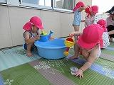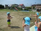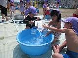足元に流れてきた水に「冷たい」と大喜び。また、ペットボトルの容器に水を汲み「どうぞー」と水を分け合ったり自分にかけたりして遊びます。今年から水着を着て遊ぶようになったさくら組さんは着替えるのは大変ですが「かわいい?」「かっこいい」と水着を見せ合って大満足です。