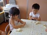 初めての粘土遊びをしました。こねたり、つぶしたり、ちぎったりしながら感触を楽しみました。形にした物を友達や保育士に見せながら「ケーキ」「かいじゅう」「へび」などと様々なものに見立てていました。