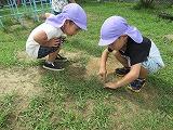 秋の気配が感じられるようになり、園庭には夏とは違った様子が伺われます。柿の木の下にはまだ青い柿が落ちています。最初は何の実かわからずにいた子ども達でしたが、今では「かき、かき」と嬉しそうに拾ってきます。また、園庭にはバッタも顔を出すようになり「アリかな?バッタかも」と小さな動きを見逃しません。