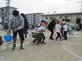 ゆり組さんは親子で風船を体に挟んで走ります。協力しながら慎重に運びました。最後は風船を割ってゴールしました。