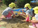 ちゅうりっぷ組さんは砂場に入るとすっかり自分の世界、「ジュース」「プリン」と言いながらカップに砂を入れたり「ガガガー」とショベルカーを走らせたりします。バギーカーでは「おもちゃ買ってくる」とお出かけです。