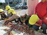 一輪車2台分もの収穫がありました。堀り終えた後も「もっとあるかもよ」と念入りに掘り返す子ども達。時々顔を出すミミズや幼虫にも「これはカブトムシの幼虫だよ」と大喜びでした。掘ったお芋をテラスに並べてみました。「どれが一番大きいかな?」