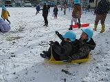 今日は今年初めての雪遊びです。少し積もった雪をかき集めながら「見て、こんなに大きくできた」と雪玉を見せ合います。ゆり組さんは「行くよー、そこどいてね」と言いながら築山からのそり滑り。登っては滑り、滑っては登るを繰り返し、いつの間にか体もぽかぽかです。
