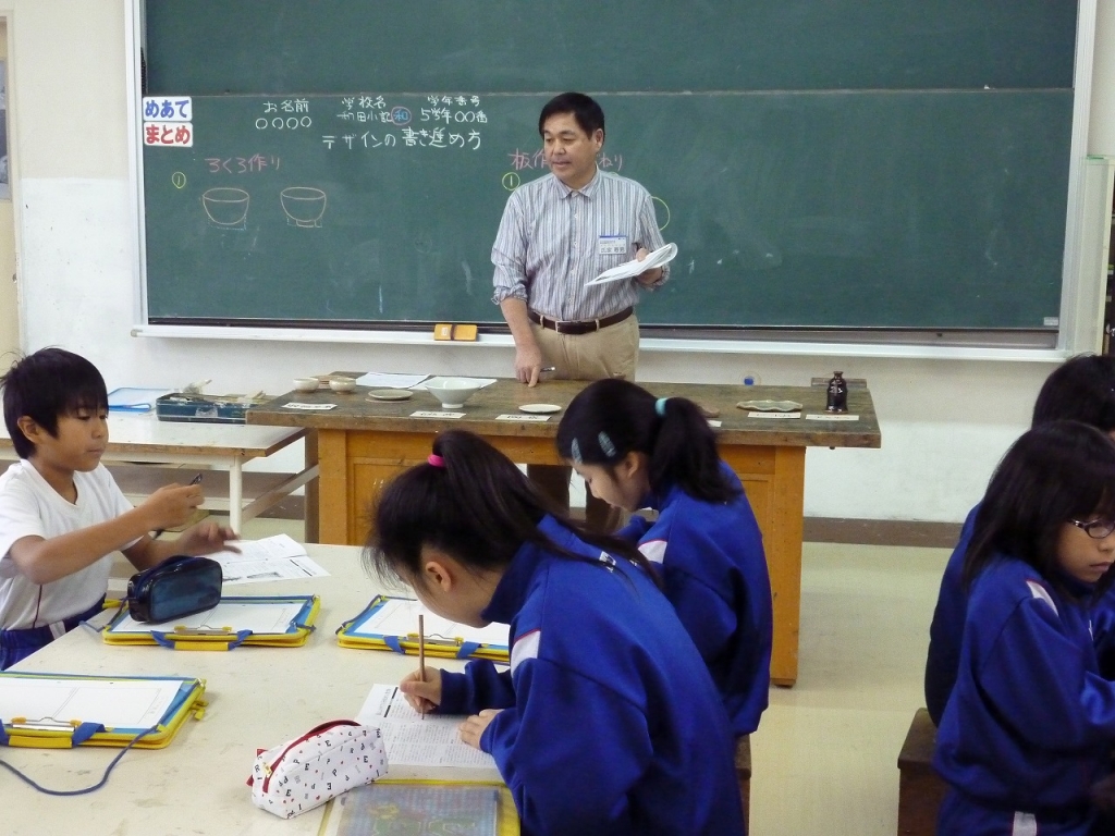 伝統工芸の一つである「陶芸」を学ぶ機会を設け,前半は「陶芸の基本知識・陶芸の概要」についてご説明がありました。後半は,子どもたちが制作をする作品のデザインづくりにチャレンジしました。初めての体験でしたが,陶芸に興味・関心を持ち,意欲的にデザインを考えていました。来週は,このデザインを基に2種類の制作を行います。①板づくり②ロクロです。各自,マグカップや皿,コーヒーカップなど自由にスケッチをしました。また,粘土から板状にする過程も見せて頂きました。来週が楽しみです。