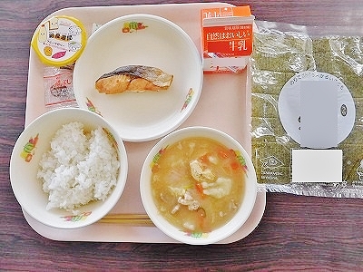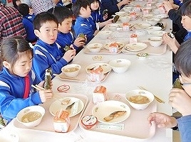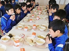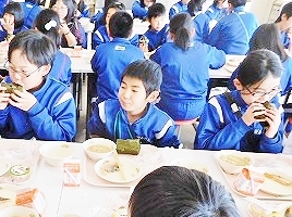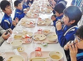 2017年1月25日 10時00分 1月24日(火)は,全国学校給食週間(24日~30日)の行事として,普段とは異なるメニューによる給食でした。それは「粗食給食」でした。「ごはん,すいとん汁,梅干し,のり,さかな,ゼリー,牛乳」など,特別な献立ではありませんが,ほとんど和食メニューでした。「〇〇が嫌いだから・・」「〇〇だけ食べたい・・」など,豊富なメニューが存在する現代社会では,個人の好みを反映した食事が多く見られます。学校給食では,単に「食事をする」という目的だけではなく,子どもたちの「成長の過程」で大切な栄養素やエネルギーを摂取しやすいよう工夫されたメニューとなっています。しかし,「〇〇は苦手です」「〇〇は食べられません」という個々の事情や状況もありますので,相談をしながら食事をしています。また,学校給食では,バランスの取れた食事を提供し,子どもたちや家庭の皆様へ,大切な情報(献立表)として,お伝えする役割もあります。今回は,「粗食給食」でしたが,子どもたちの食事の様子を観ますと,楽しそうに,美味しそうに頂いていました。ぜひ,ご家庭で「食生活」についてご家族の皆様と,お子さんとでお話ができれば幸いです。➡