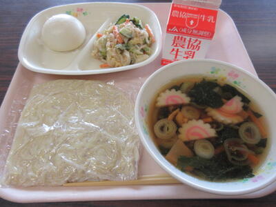 中華めん、醤油ラーメンかけ汁、ミニ肉まん、蒸し鶏のごまだれあえ、牛乳 614キロカロリー