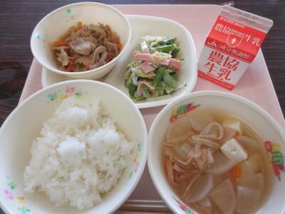 ごはん、大根のみそ汁、焼き肉丼の具、アスパラサラダ、牛乳 625キロカロリー