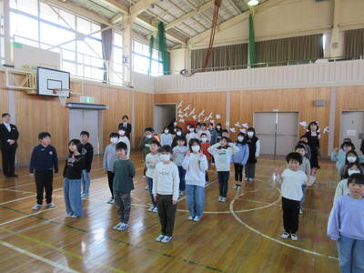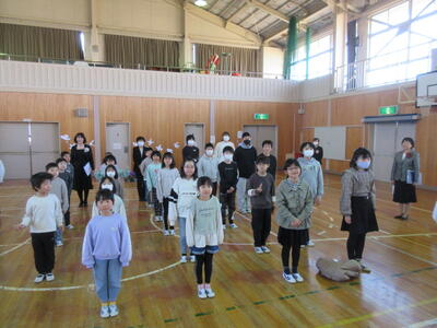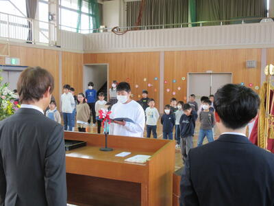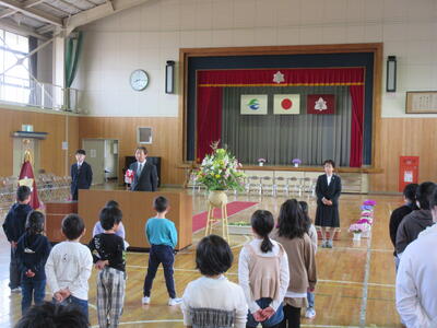 新しく3名の先生が転入されました。代表の6年児童が歓迎の言葉の中で学校の紹介をしました。全員で校歌を斉唱しました。3学期よりも声が出ています。よろしくお願いします。