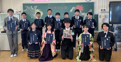 七十年くらい前に作られた校歌について気づいたことを話します。作詞した並木さんは本名を根本さんと言い、和田小の出身です。一番の「流れにくまん 日々の幸」は阿武隈川の水をくんで農作物を豊かに実らせること。二番の「しおりとならんいざ共に」は力を合わせて足跡を残していくこと。三番の「道はひらけてなないろに 輝きわたる 和田の里」これは、「努力を続けていけば きっと和田がどんどん発展していくよ」という励ましです。みなさんの根気強さ、責任感、そして福祉の学習でも育てた思いやりの心は、先生達も在校生もよく知っています。その姿に、在校生もがんばろうと思ったはずです。中学校の勉強や部活動、その後のいろいろな経験を生かして、福島県や本宮市、そして和田地区の発展のために力を貸してください。もちろん、皆さんだけががんばるのではありません。地域の先輩達と力を合わせていくのです。自分の将来の夢とまわりの人たちの幸福を両立できるように、自分の良さを磨いて、人から感謝される人になってください。みなさんの成長を いつも願っています。