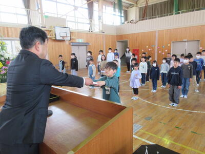 着任式終了後、新学年の担任と職員を発表しました。職員にも児童にも「よろしくお願いします」という気持ちがみなぎりました。始業式では、校長から「1年間の心構え」を話し、6年代表児童に教科書を給与しました。