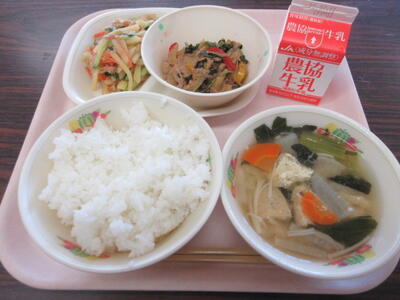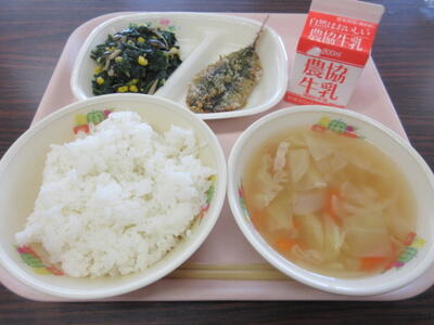 ごはん、キャベツスープ、いわしのパン粉焼き、ほうれん草とコーンのソテー、牛乳 640キロカロリー