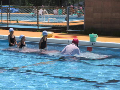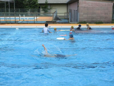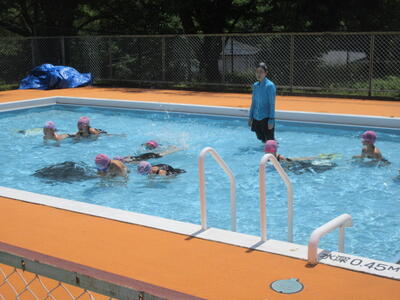1、2年生は今日で4回目のプール学習です。段階的に一歩一歩できることを増やしていきます。1年生は、小さく浅いプールで、手で「わにさん歩き」、鼻から息を吐きながら前進します。2年生は、水中の物を拾いながら、もぐる練習です。「4m泳ぎました。」という子もいました。みんな水に慣れて、元気に挑戦しています。