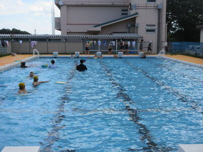 1~5コースに能力別に分かれて25mを泳ぐ練習です。まだ25mを泳げない児童は、1~3コースでビート板を使った息継ぎとキックの練習(写真の左から3つ)、25mを泳げる児童(4年2人、5年5人、6年3人)は4・5コースで、泳法を変えて繰り返し泳ぎます。クロールの息継ぎの時、斜め後ろを見るつもりで顔を上げないと前からの水をかぶってしまいます。力で泳ぐのではなく形、タイミングをよくして、省エネで泳げるように挑戦しています。