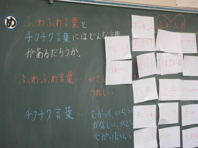 和田小では、全学年の学級活動で、いじめ防止の一環として、言葉遣いを指導しています。優しい、うれしい感じになる「ふわふわ言葉」と言われると心が痛む「ちくちく言葉」について、どんな言葉を知っているか聞くと、後者の方が多く出てきました。イライラしているときや、けんかしたとき、あおられたときに使うことがあると正直な発言もありました。「そういうときに、どうする?」と聞くと、「がまんする」「その時は言わずに、一人になったときに言う」という考えも出てきました。小学生でもSNSの投稿で使ってしまう場合があります。法律も厳しくなっており、日常の言葉遣いを振り返ることが大切です。