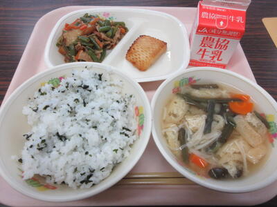 わかめごはん、山菜のみそ汁、いかのみそ焼き、いんげん炒め煮、オレンジ、牛乳 646キロカロリー