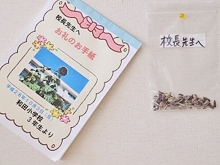 ある時,3年生の子どもたちが「トントン!失礼します。」と,職員室へ来ました。すると,「用務員さんと校長先生に用事があって来ました。」と代表の子どもが話しました。「ぼくたちのヒマワリが台風により倒れないよう,お世話をして下さりありがとうございました。」と,用務員さんと校長へお礼の手紙と種をプレゼントしました。とっても嬉しかったです。一人一人のヒマワリが台風から守られ,倒れずに種の収穫までできたことへの喜びでした。