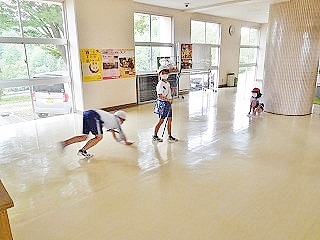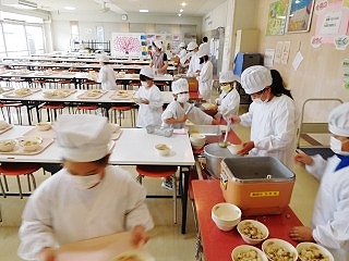 縦割り班による清掃活動も,校舎への思いやりや愛校心を持ちながら清掃に取組んでいます。高学年の子どもから低学年の子どもたちへ「〇〇は,こうするんだよ。」など,教えている姿も見られます。また,ランチ当番も同様で,縦割り班による配膳活動の中で見られます。