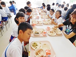 給食の時間,「美味しいです。」と,楽しい会話も交えながら頂いています。複数で食事を行う「よさ」は勿論ですが,一緒に食事を行うことを通して,午前中の出来事や,昨日のこと,興味・関心を持っていることなど会話し,楽しい時間となります。