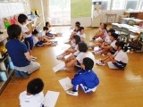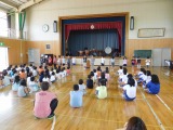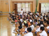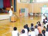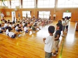 1学期の学校生活を振り返り,キーワードを提示しながら,和田小学校の子どもたちの様子や努力してきたことを伝えました。まず「36」というカードを提示し,子どもたちに問いかけをしましたところ,数名の挙手があり,考えを聞きました。「低学年のみんなが休まなかった日数です。」と,5年生が答えましたので,校長から「36は,休まないで全員が登校した日数です。」と意味を伝えました。1学期の半分は,出席100%ということです。次に,「9」というカードを提示しました。すると,挙手した4年生が見事に「暗誦10個を合格し,表彰された人の数です。」と,正解を発表しました。その後,「じぶん」「みんな」「がんばり」「あきらめず」などのキーワードを提示しながら,1学期のまとめを話しました。
