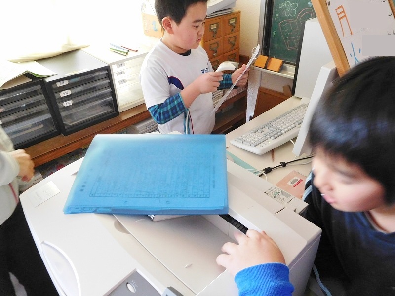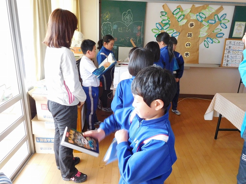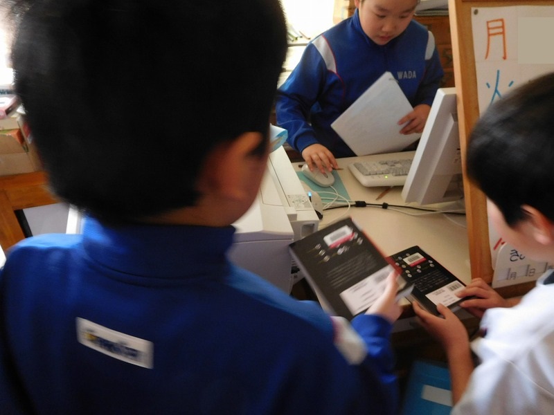 そこで,以前にもお知らせしましたが,より多くの読書時間を確保できるよう,22日から「家読パワーアップ大作戦」がスタートし,まず,1・2年生が,学校にあります「図書」を各自選び,1週間の貸し出し中に読書を進めることにしました。早速,書棚から各自1冊,バーコードで登録しながら借用しました。