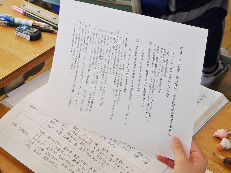 次回は,4年生の子どもたちが俳句教室で学びます。和田小学校では,平成26年度から「川柳づくり」と「俳句づくり」に,全校児童で取り組んできました。平成27年度には,「川柳づくり」で,1年生から6年生まで「川柳作品」を仕上げ,福島県川柳賞へ出品し,見事に「学校賞」と2名の「児童奨励賞」を受賞することができました。「俳句づくり」も,2年目を迎え,3年生以上の学年が取組むことになりました。伝統ある日本文化(川柳・俳句)を学ぶ場と機会を設けたことにより,子どもたちが日本の「よさ」,ふるさとの「よさ」を実感できれば幸です。