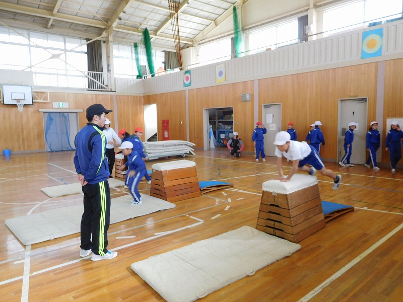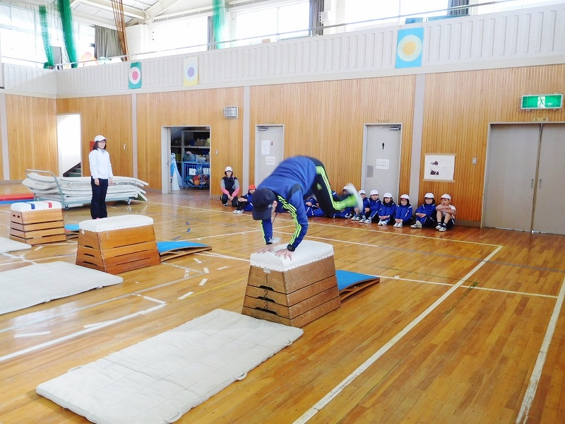 特に,器械運動の分野は,模範演技や動き方・手順など,視覚的に伝える場合が多くあります。ビデオより,実際の演技から「技のポイント」について伝えることができ,さらに子どもたちの「目標」にもなります。ここに,普段の体育との違いがあり,貴重な場と機会を設けた理由です。順次,1週間の様子をご紹介してまいります。乞うご期待!