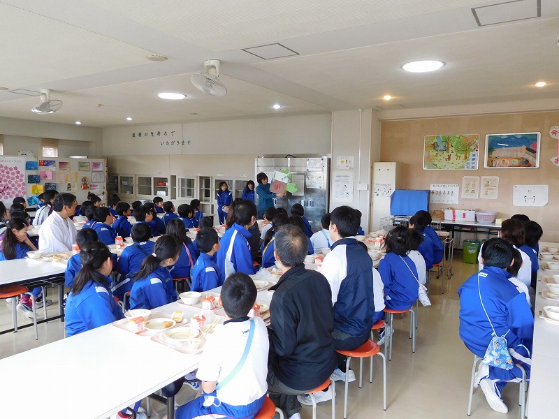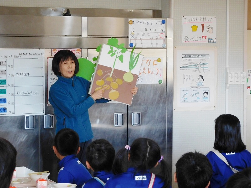1月14日(木),給食後の時間に,和田小学校では全教職員が計画的に,「食育」に関するミニ講話を行っております。今回は,3年の先生から「根菜を食べよう!」という内容のお話がありました。冬の健康維持と根菜類の効果についてイラストを交えながら講話があり,分かりやすく伝えていました。このように,和田小学校では食育タイムを通して,「食の大切さ」と「こころの育み」も進めています。