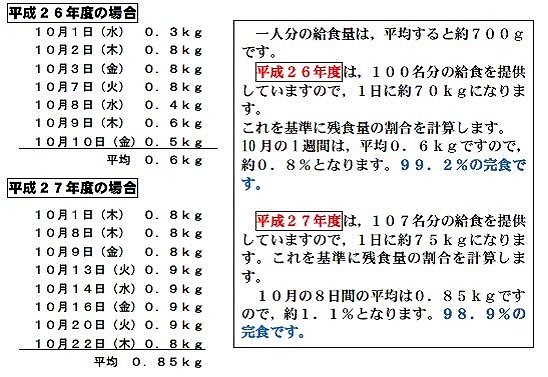 このように,給食の残量をみますと,昨年度と今年度では特に「差」は見られません。子どもたちは,10月のこの季節,「給食」を残さず食べることで,学習や運動,遊び,生活を過ごすエネルギーとなっています。元気に,学校生活を進める「源」として,「食」は大変重要なことです。