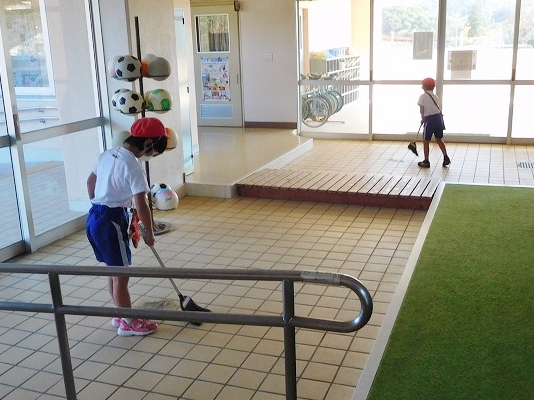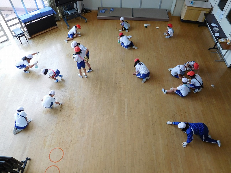 ※1年生から6年生まで,教師と一緒に準備や床ぶきをしています。
