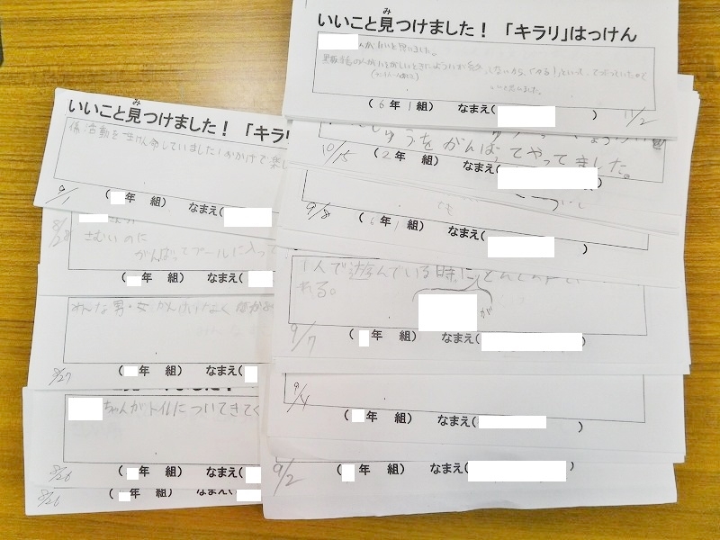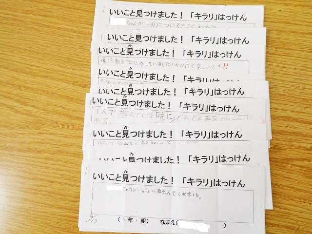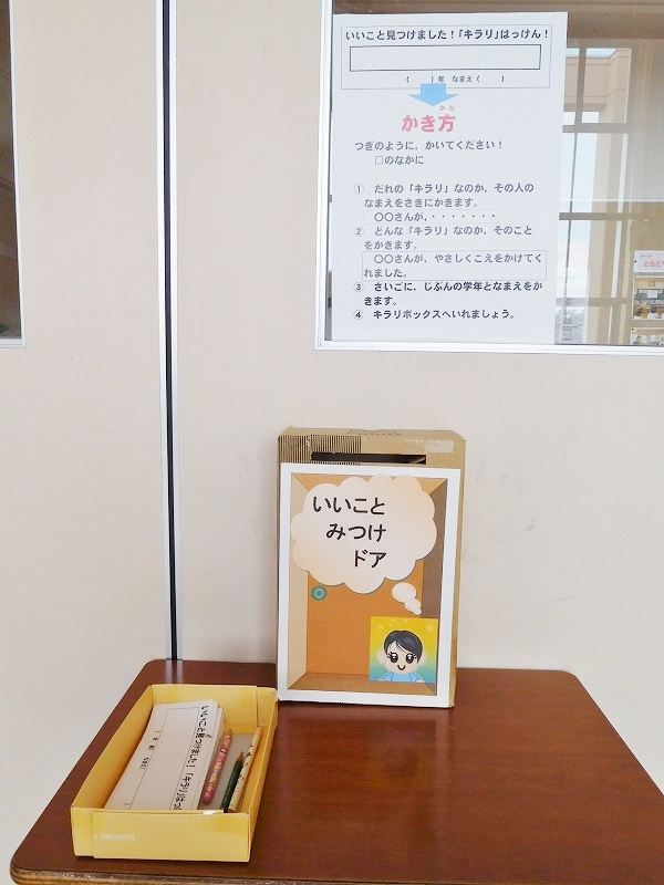 相手の「よさ」や「努力」を見つけ,称賛する行動(「いいこと見つけ」ボックスへの投函)は,人間関係形成力・自己肯定感を育む上でも貴重です。今後も子どもたちが安心して生活し,多くの「キラリ」が発見できるよう『学校づくり』を進めて参ります。「こころの育み」と「人間関係形成力・自己肯定感」の向上は,これからも大切に進めて参ります。