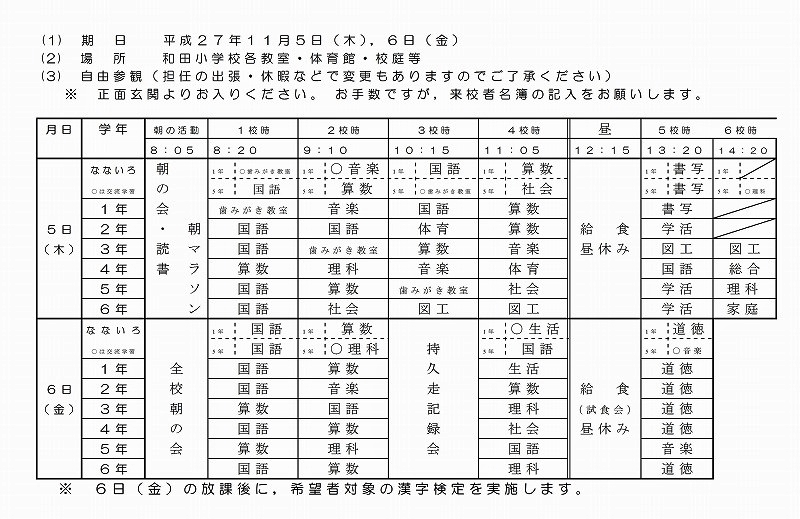 多くの皆様方に子どもたちの学習や学校生活の様子など,ご覧いただければ幸いです。すでに,保護者の皆様方へ「ふくしま教育週間」のご案内をお知らせしておりますが,下記に「教育週間」の予定等を掲載しますので,ご参考にしていただければ幸いです。なお,来校時には,ご氏名等を記入していただくことになりますので