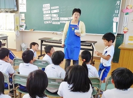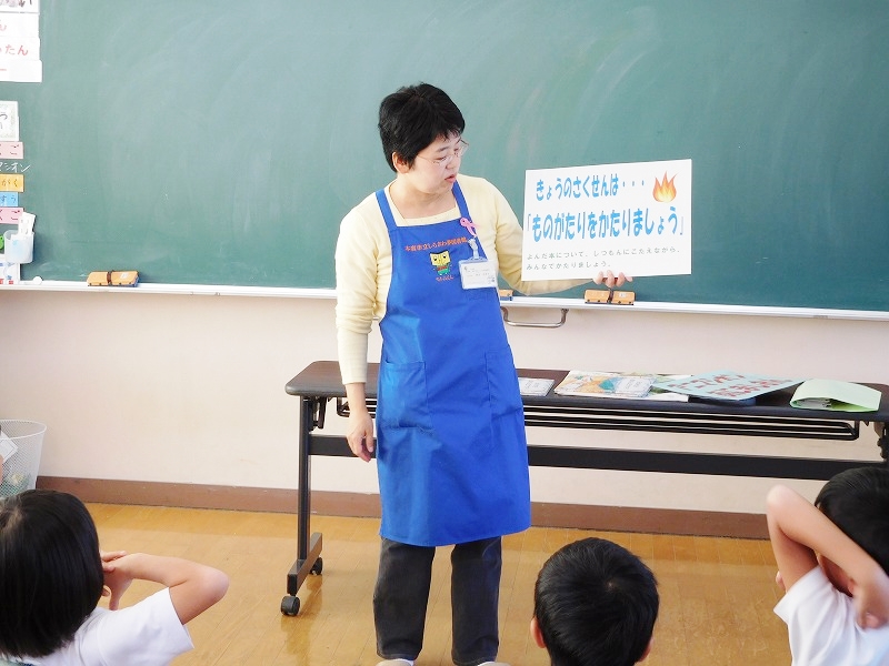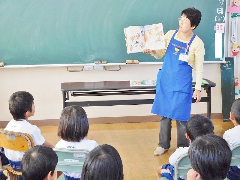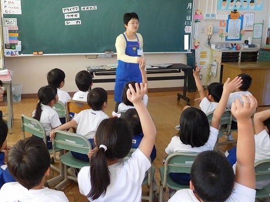 10月9日(金),「アニマシオン」を行いました。しらさわ夢図書館の司書の方が来校され,楽しいアニマシオンを進めました。ありがとうございました。今回は,絵本の読み聞かせ後,登場人物や物語の順序を問う内容の「質問カード」を準備し,子ども自身がカードを読んで,「〇〇は・・・」と子どもたちへ問いかけました。質問カードに従い,子どもたちは記憶していた内容や観察していた挿絵を発言していました。読み聞かせを通して,「しっかりと聞く」「しっかりと挿絵をみる」という態度を育てるには効果的な「アニマシオン」です。
