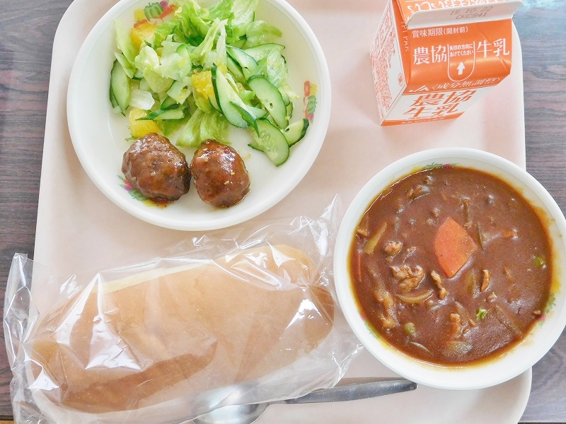 今回の献立は,「米粉パン・ビーフシチュー・夏みかんサラダ・野菜肉団子・牛乳」でした。柔らかい牛肉の触感と,コクのあるシチューはとてもおいしかったです。野菜肉団子もふわふわで,口の中に肉汁が広がりました。米粉パンは,普段給食には提供されませんが、久しぶりの米粉パンは,フワフワ感がとってもあり,口の中へ入れるとその感触がおいしさを倍増しました。サラダのキュウリやレタスもシャキシャキで,夏みかんの甘さと調和していました。