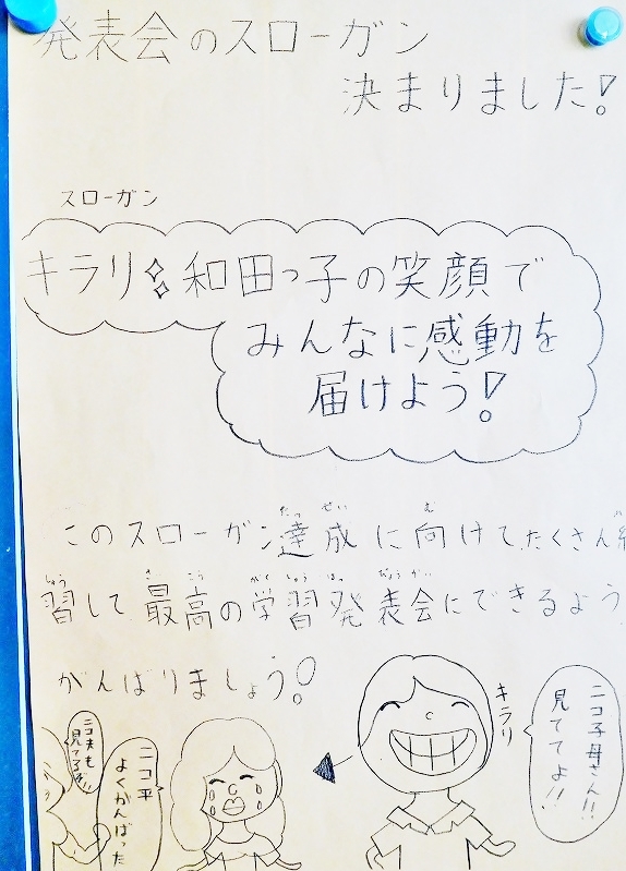 発表会へ向けて,子どもたちは「実行委員会」を立ち上げ,発表会のスローガンを作成しました。スローガン作成に当たり,1年生から6年生まで各学級で話し合われたものを基に,慎重審議の結果,実行委員会にて決定しました。