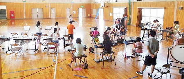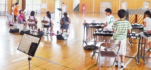 夏休みに入り,約10日間が過ぎようとしています。暑い日が続いている中ですが,5・6年生の子どもたちは暑さを吹きとばす気持ちで,「合奏練習」に取組んでいます。指導をしている先生も汗だくですが,「心を一つ」に励ましています。