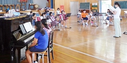 毎日,真夏日のようです!和田小学校では,8月1日より育児休業でお休みをしていた先生が復帰され,今日(8月3日)から合奏の指導を行います。