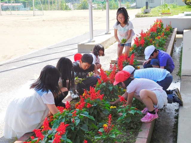 6月29日(月),昼休みの時間,校舎前の花壇の草むしりを行いました。子どもたち自身による「ボランティア活動」でした。自主的に,時間を確保した子どもたちが,手際よく草を取り,きれいにしていました。このように,自主的な活動や行動こそ,子どもたちの「人間力」を育むために必要な行動力です。
