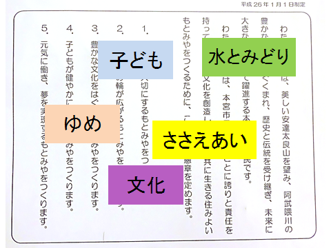 将来,社会の一員として活躍する子どもたちが,「かがやく もとみや」に住んで,「もとみやをつくる」大人になってほしいと願います。