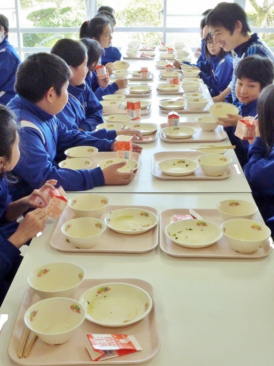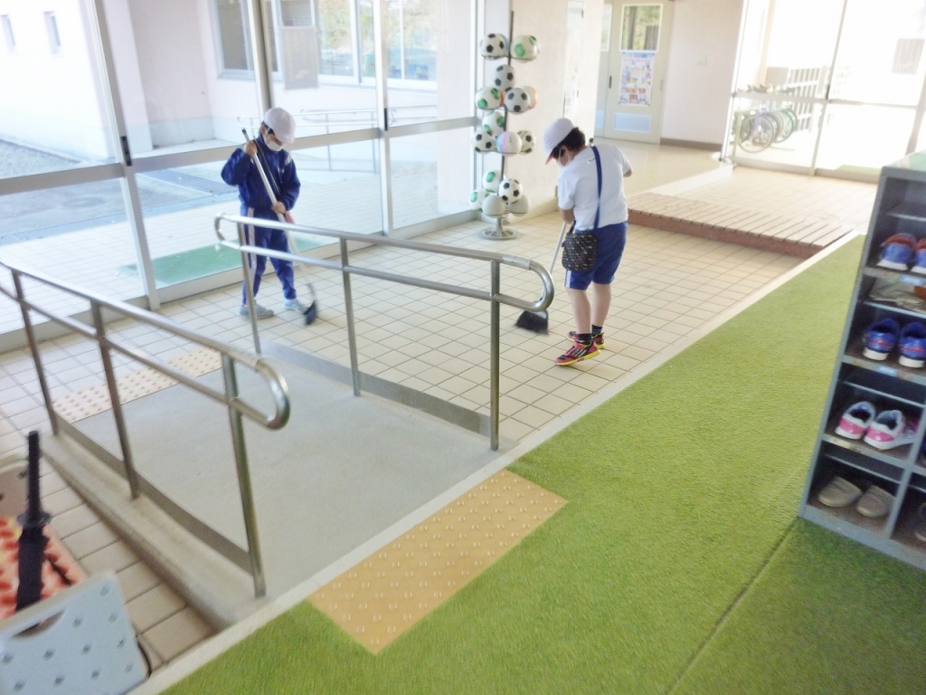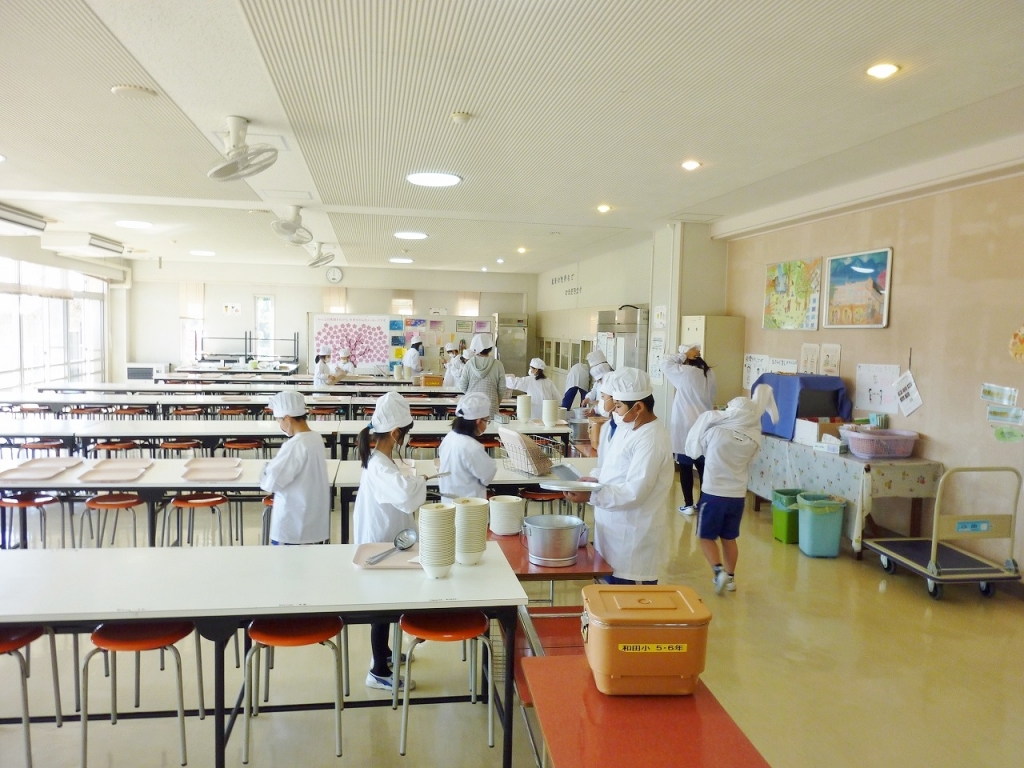 ○掃除の時間と給食準備の時間。熱心に活動をしています。1年生から6年生まで