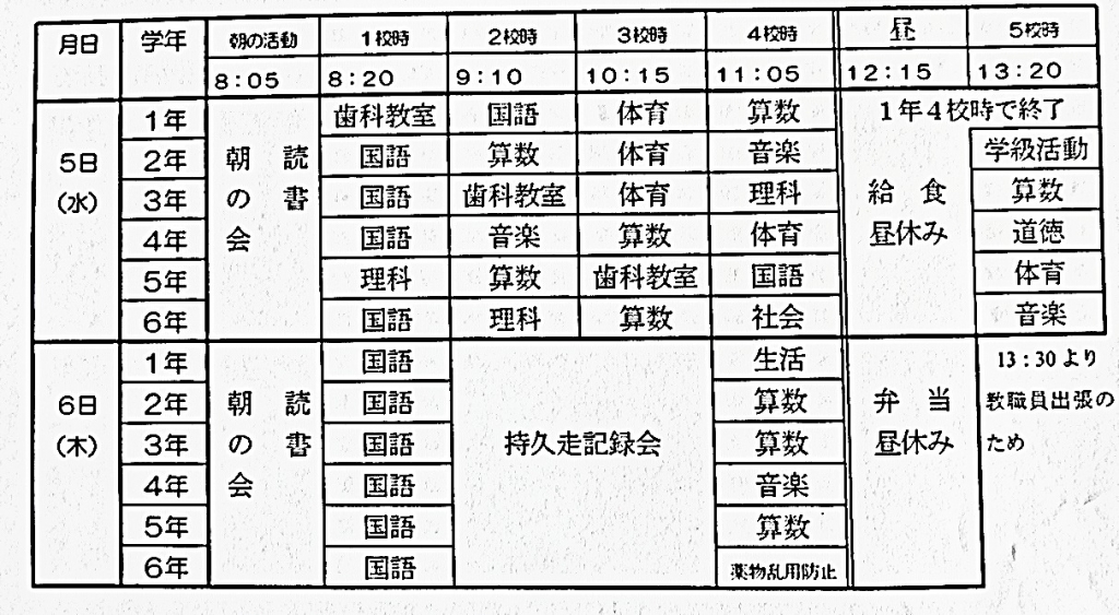 ○教育週間中に、校内持久走記録会、薬物乱用防止教室、歯みがき教室も予定されています。