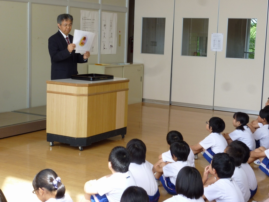 今年度、最初の校長による講話(授業)を行いました。道徳教育に関連した内容を中心として、講話を進めます。年間、数回を予定しています。今回は「家族愛」の価値に関した読み物資料をもとに、話をしました。子どもたちには「紙芝居の題名を考えながら聞きましょう。」と問いかけてから進めました。