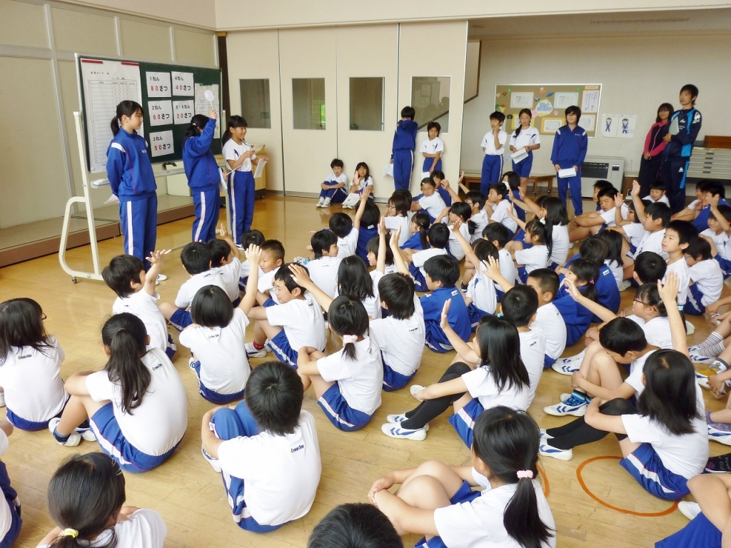 全校児童が集まる中、役割分担により、分かりやすく説明をすることができました。