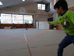 みんなで投げコマ回しの練習中!目指すは、前回のチャンピオンJ君に勝つこと。