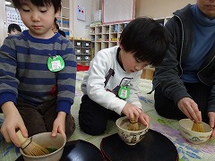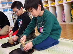 「葉っぱの匂いだ!」と目をキラキラさせ、五感を働かせて一心にお茶を点てていました。