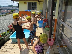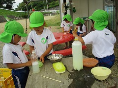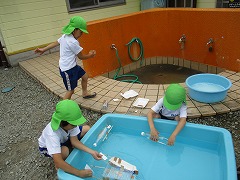 石けんを使って泡作りをしたり、船が早く進むよう工夫して作ったりと、挑戦する気持ちが育っているぞう組さん。