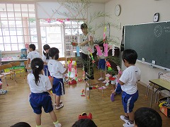年長さんが採ってきてくれた笹に短冊や笹飾りをつけました。