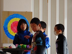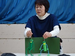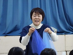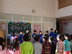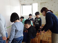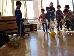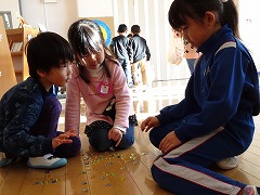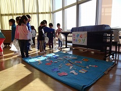 和田小学校の1年生が「なかよしかい」を開いてくれました。あやとり、おはじき、魚釣り、ボーリング、的あて、のコーナーがありました。どれも、楽しいことばかりでした。子どもたちは目を輝かせて、取り組んでいました。