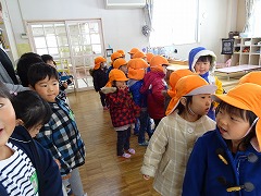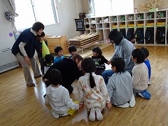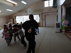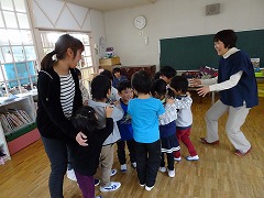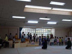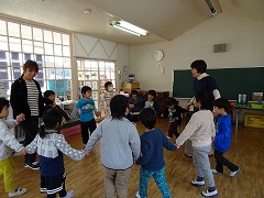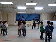 4歳児も、5歳児も上手に円を作り、拍を感じながら動いている姿を見て、講師の中村秀子先生が、「日々、わらべうたを楽しんでいるのが、よくわかるね~。」と、喜んでくださいました。子どもたちの反応のよさに、教師も、感心したり、笑ったり、とても楽しい時間でした。