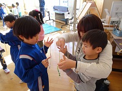 1年生の教室には、クリスマスリースや学習の成果が飾ってありました。とても、綺麗な学びの環境で、卒園した子どもたちの立派な成長に、感動しました。5歳児のお友だちはとても刺激されたようです。幼稚園に戻ってきて「どれもこれも、みんな楽しかったね!」と、さっそくあやとりを始めていました。